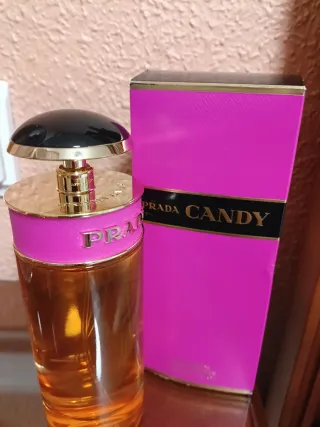 Perfume Candy de Prada para mujer. Un aroma dulce y vibrante , 100 ml - Frasco con detalles dorados y banda fucsia. - Líquido de color ámbar.