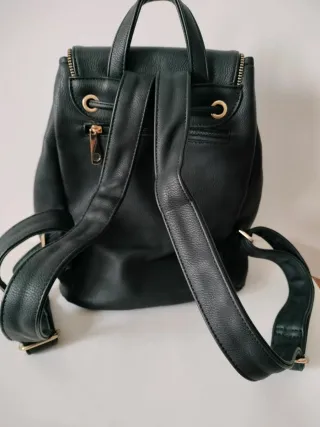 Bolso estilo mochila en color negro. - Cierre principal de boton-iman dorado. - Bolsillos exteriores con cremallera dorada. - Asa superior y correas ajustables. - Detalle de cordón ajustable en la parte interna y cierre de botón-imán también. - Bolsillos traseros con cremallera dorada