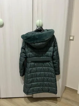 Abrigo de invierno con un diseño moderno y cálido. - Material exterior tipo ante. - Forro interior de pelo sintético. - Cierre de botones. - Bolsillos laterales. Es muy bonito se le a quedado pequeño a mí madre Pero está muy bien cuidado Y no se a puesto en varias ocasiones