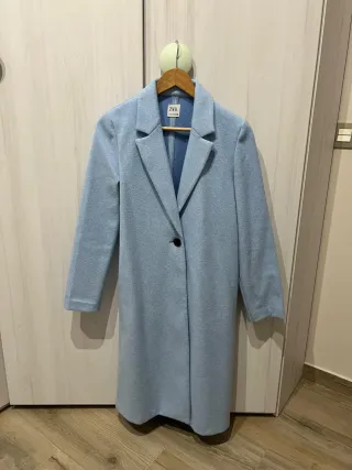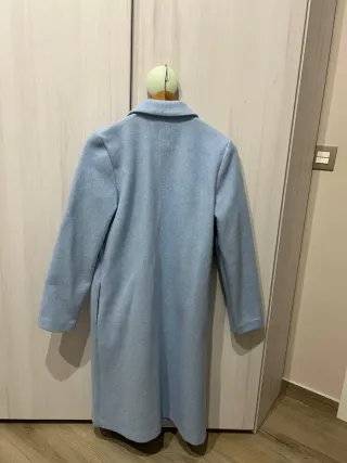 Abrigo de tela suave en tono azul claro. - Diseño clásico con cuello. - Manga larga. - Bolsillos laterales.