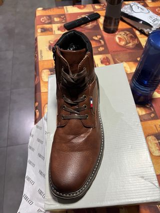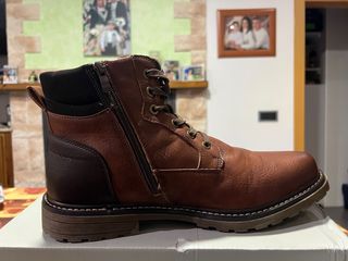 Botas de vestir de cuero sintético en tono marrón. Cuentan con un diseño moderno y práctico. - Cierre lateral con cremallera. - Cordones decorativos en la parte frontal. - Detalle de costuras. - Suela de goma antideslizante.