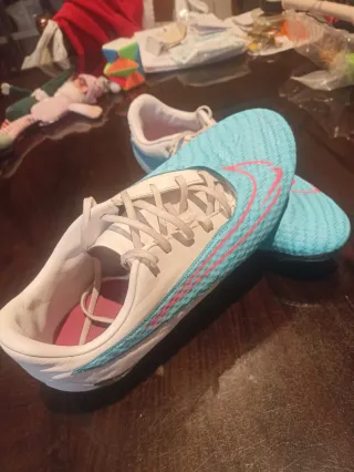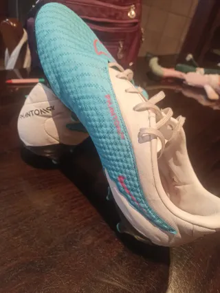 Botas de fútbol Nike Phantom con tacos. Usadas un par de veces solamente - Diseño en color azul y blanco. - Detalles en color rosa en el lateral.