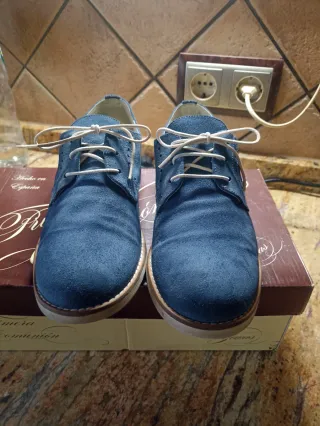 Elegantes zapatos de ante para comunión. Puestos unas 4 horas escasas. Para las fotos de comunión y para la iglesia. Costaron 61 euros - Material: Ante - Color: Azul - Talla: 39/40 - Cierre: Cordones - Suela: Goma - Fabricado en España