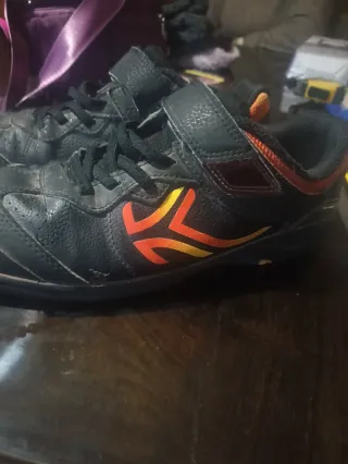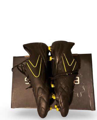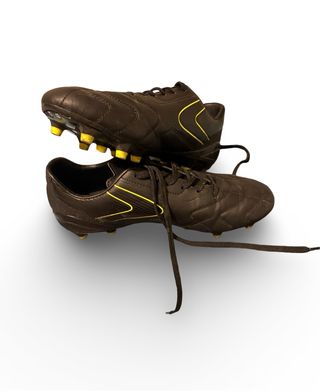 Par de zapatillas de fútbol con un diseño moderno. - Color principal negro con detalles amarillos. - Suela con tacos para césped. - Se ven nuevas y con poco uso, hechas para cualquier niño con ilusión.