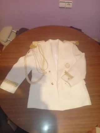 Uniforme de gala de estilo militar, con detalles dorados. - Chaqueta de corte clásico. - Botones dorados. - Hombreras con flecos dorados. - Galones dorados en las mangas. - Cordón de gala dorado.