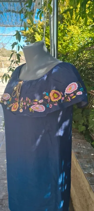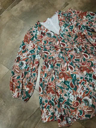 Precioso vestido corto con estampado étnico/boho en tonos suaves (azul, coral y beige). Es una prenda muy fluida y favorecedora, ideal para el verano o eventos casuales. Cuenta con un escote ajustable mediante lazada en el cuello y un volante en el bajo que le aporta mucho movimiento. Se encuentra en perfecto estado. Detalles del producto Diseño: Estampado ornamental con detalles florales y geométricos. Corte: Suelto con manga corta y terminación en volante. Estado: Muy bueno / Como nuevo. Medidas Pecho: 48 cm Largo: 90 cm #vestidoboho #estiloboho #vestidoverano #bohochic #etnico #casualstyle #vintedspain #bohostyle