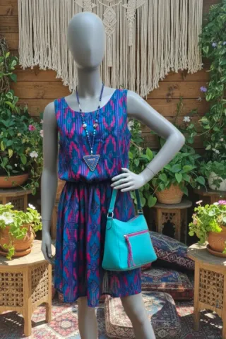 Vestido corto azul y rosa estampado étnico