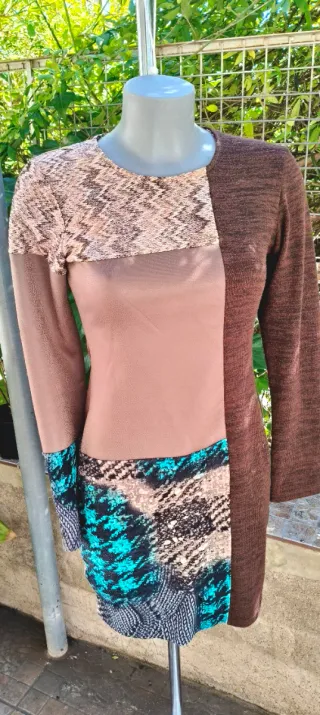 Vestido corto de la marca JM Buendia con un original diseño de patchwork que combina diferentes texturas y estampados (zigzag, liso y geométrico con toques turquesa). Es de manga larga y tiene un corte entallado muy favorecedor. Ideal para un look casual con un toque diferente. Se encuentra en muy buen estado. Talla: M Pecho: 44 cm Largo: 89 cm #vestido #jmbuendia #patchwork #casual #multicolor #invierno #otoño #vestidocorto #moda
