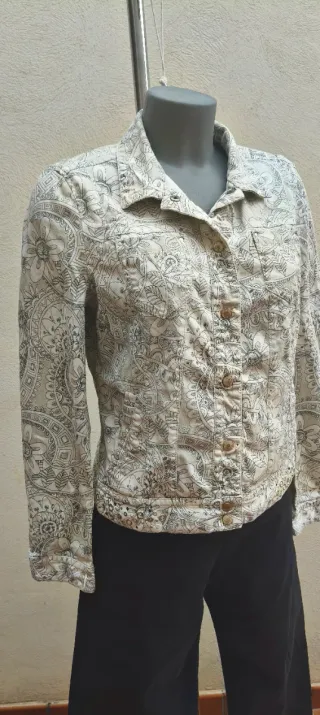 Chaqueta estilo denim de la marca Marc Cain Sports, con un diseño artístico de estampado floral y geométrico en tonos grises sobre fondo crudo. Presenta un cierre frontal de botones metálicos dorados grabados con el logo de la marca y detalles de tachuelas decorativas en el bajo. Incluye prácticos bolsillos laterales y bolsillos en el pecho. Es una prenda versátil de alta calidad ideal para un look casual sofisticado. Se encuentra en buen estado. Medidas Pecho: 46 cm Largo: 56 cm #marccain #marccainsports #chaquetamujer #chaquetaestampada #casualstyle #bohochic #luxuryfashion #vintedspain #vintedfrance