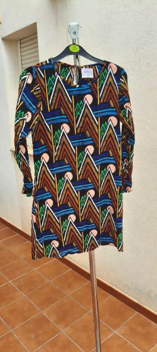 Precioso vestido de la marca Compañía Fantástica con un llamativo estampado geométrico de inspiración étnica sobre fondo negro. El diseño presenta motivos de montañas y soles en tonos naranja, verde, azul y amarillo. Es una prenda muy cómoda y fluida, ideal tanto para un look casual como para algo más especial. Cuenta con una pequeña abertura en la espalda con cierre de botón. El tejido exterior es 100% viscosa y tiene un forro interior de algodón. Se encuentra en muy buen estado. Medidas Pecho: 41 cm Largo: 82 cm #vestido #compañiafantastica #etnico #geometrico #boho #casual #print #viscosa #primavera #verano