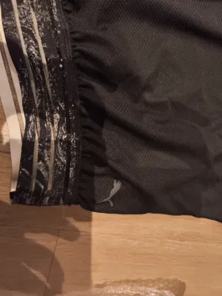 Camiseta deportiva Puma de color negro con detalles de malla. - Diseño con paneles de malla en mangas y laterales. - Cintura elástica con detalles gráficos.