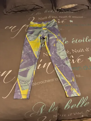 Mallas deportivas Reebok con un diseño llamativo. - Estampado abstracto en tonos morados y amarillos. - Cintura elástica para un ajuste cómodo. - zona entrepierna con las hilos un pelín gastados, pero no rotos ni con agujero