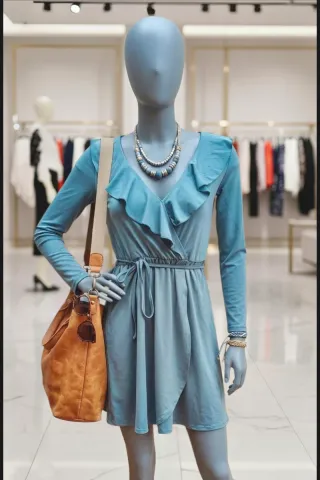 Precioso vestido corto en un tono verde azulado (teal) muy favorecedor. Destaca por su elegante escote en V con volantes y un diseño tipo "wrap" (cruzado) que estiliza la figura. Cuenta con una cintura elástica acompañada de un lazo ajustable para marcar la silueta y manga larga. El tejido es ligero y fluido, compuesto por un 94% poliéster y 6% elastano, lo que le aporta una caída perfecta y algo de elasticidad para mayor comodidad. Se encuentra en buen estado. Medidas: Pecho: 40 cm Cintura (estirada): 40 cm Largo: 82 cm #vestido #vestidovoloantes #verdeazulado #vintedespana #ropamujer #casual #chic #vestidocorto