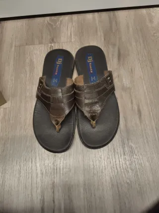 Sandalias de hombre con un diseño moderno y cómodo. - Tira superior de cuero marrón con costuras. - Suela interior negra con logo. - Tira de sujeción entre los dedos.