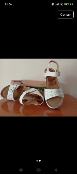 Sandalias de cuña en color blanco, perfectas para un look casual. Vienen en su caja original. - Diseño con tiras y detalle floral. - Suela con relieve para mayor comodidad. - Cierre de velcro ajustable. Descripción: Estado: NUEVAS A ESTRENAR, en su caja. Color: Blanco. Estilo: Sandalia de cuña/plataforma con suela de confort. Diseño con detalles calados y una flor decorativa. Ventaja: ¡Cómpralas hoy y recíbelas en días! Evita la larga espera del envío de TEMU. Precio en Vinted: 12€ (Precio muy ajustado por ser nuevas) Perfectas para: Un look casual de verano, cómodas para el día a día.