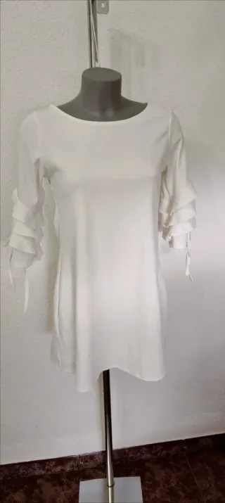 Precioso vestido corto en color blanco impecable, ideal para eventos, ocasiones especiales o un look sofisticado de diario. Destaca por sus originales mangas 3/4 con detalles de volantes en cascada y lazos ajustables en los puños. Tiene un corte fluido muy favorecedor y un cierre trasero con botón tipo lágrima. Se encuentra en excelente estado. Medidas: Pecho: 44 cm Largo: 78 cm #vestidoblanco #modamujer #vestidovolantes #festa #casualchic #estilofemenino #ropamujer