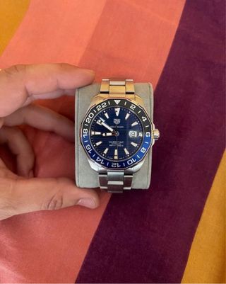 Reloj TAG Heuer Aquaracer GMT con bisel Batman. - Esfera azul. - Bisel bidireccional con marcación GMT. - Brazalete de acero inoxidable.