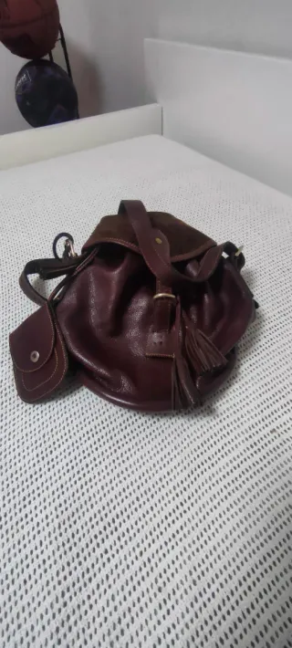 Bolso de piel en tono marrón caza, con un diseño original y detalles cuidados. Alta calidad. - Material: Piel. - Color: Marrón. - Cierre con tira y hebilla. - Adornos de flecos. - Incluye monedero a juego.