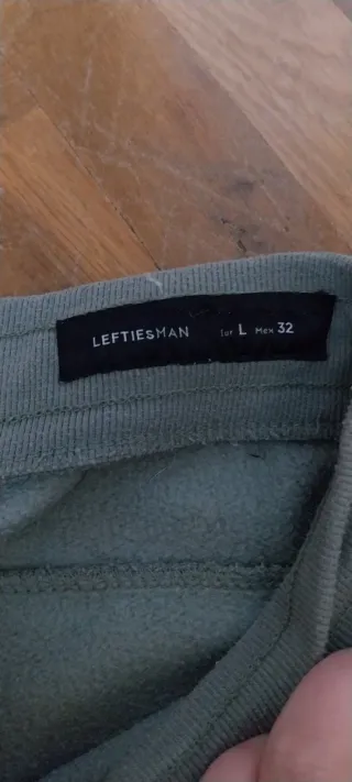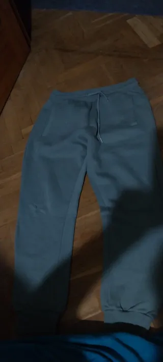 Pantalón de chándal gris con cordón. - Dos bolsillos laterales. - Puños elásticos en los tobillos. - Pequeño desgarro en la rodilla izquierda.