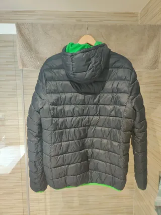 Abrigo acolchado de la marca Livergy en color negro. Presenta detalles en color verde brillante. - Capucha integrada. - Cremallera frontal. - Bolsillos laterales con cremallera.