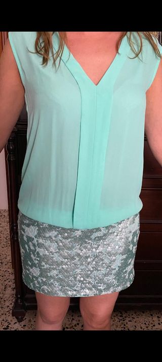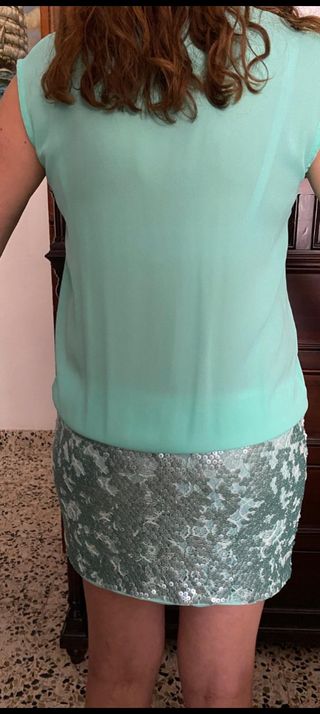 Precioso vestido de fiesta en color turquesa. Ideal para una ocasión especial. - La parte superior es de gasa, ligera y transparente. - La falda es de lentejuelas, con un diseño elegante. - Talla única, adaptable a diferentes figuras. - Perfecto estado.