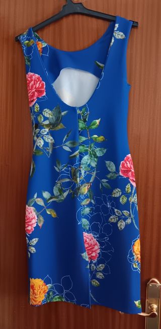Precioso vestido de flores, ideal para cualquier ocasión. Es de color azul con estampado floral multicolor. - Escote en la espalda. - Corte entallado. - Cierre con cremallera invisible en la espalda. - Tejido ligero y cómodo. Y también vendo la chaqueta el precio es por las dos cosas, la chaqueta está sin estrenar