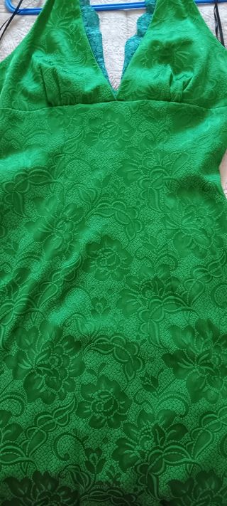 Precioso vestido de color verde, ideal para ocasiones especiales. Es de talla M y tiene un diseño elegante y sofisticado. - Escote en V. - Detalle de encaje en la cintura. - Corte entallado.