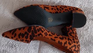 Preciosos zapatos de tacón con estampado de leopardo. Ideales para cualquier ocasión. - Estampado de leopardo en tonos marrones y naranjas. - Tacón cómodo y elegante. - Material de ante sintético.