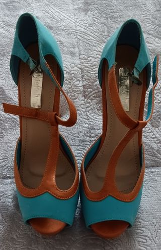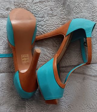 Preciosos zapatos de tacón alto, peep toe, en dos tonos: turquesa y marrón. Ideales para una ocasión especial. - Diseño elegante y femenino. - Tacón alto y cómodo. - Color combinado turquesa y marrón. - Dos pares disponibles.
