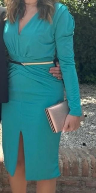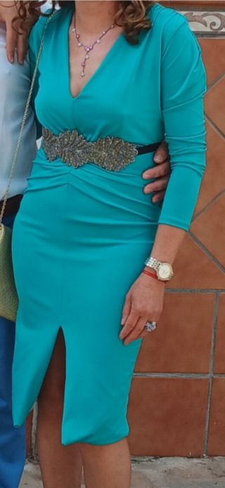 Precioso vestido de fiesta en color turquesa. Es de manga larga, con un favorecedor corte midi y abertura frontal. Luce una bonita pedrería en la cintura. Perfecto para eventos especiales. Es para una 36 o 38 para la 36 también le vale al ser licra y se ajusta al cuerpo - Escote en pico - Tejido elástico y cómodo - Largo midi