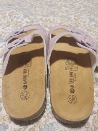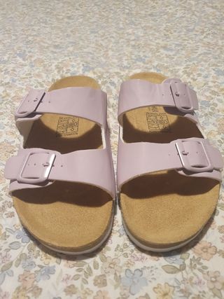 Sandalias de tiras en color lila, talla 37. Perfectas para el día a día. - Diseño con dos hebillas ajustables. - Suela de corcho y goma.