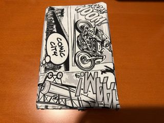 Funda de libro con un diseño inspirado en cómics, con solapa. - Estampado de cómic con escenas de acción y onomatopeyas. - Diseño en blanco y negro.