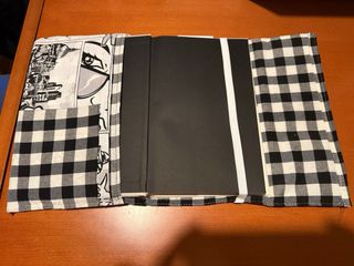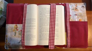 Funda para libro abierto con un diseño único y llamativo, está acolchado en todo el libro, hay mas modelos de telas, se pueden elegir y para darle el último toque se puede bordar el nombre de la persona o lo que se quiera