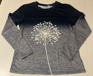 Camiseta de manga larga con un diseño degradado de azul a gris y un estampado de diente de león. - Diseño degradado. - Estampado de diente de león blanco. - Manga larga.