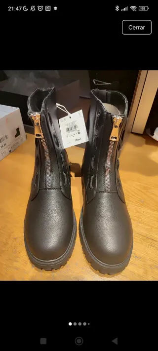 Botas de estilo militar con un diseño moderno y detalles llamativos. - Cierre frontal con cremallera dorada. - Ojales decorativos. - Suela gruesa y resistente.