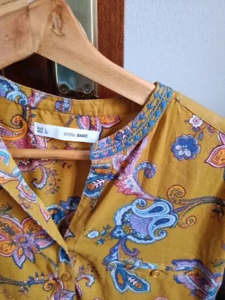 Camisa de manga larga con un bonito estampado floral y paisley en tonos ocres y azules. Cuello mao con abertura y cierre de botones. - Diseño con estampado paisley. - Cuello mao. - Cierre de botones.