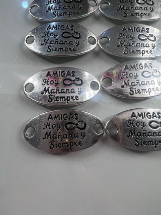 Lote de 12 chapas con diseño de infinito y la frase Amigas Hoy Mañana y Siempre. Ideales para crear pulseras o bisutería. - Diseño de infinito. - Mensaje Amigas Hoy Mañana y Siempre. - Color plateado.