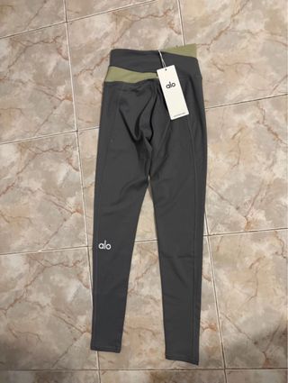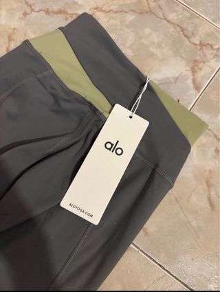 Mallas deportivas de la marca Alo con un diseño moderno. - Combinación de colores gris y verde oliva. - Logo de Alo visible en la pierna.