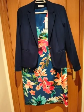 estampado floral sobre fondo negro. - Diseño con cuerpo de manga corta. - Falda plisada con detalle de cinturón. - Estampado de flores en tonos rosas y blancos.estampado floral sobre fondo negro. Talla 46 nuevo con etiqueta,lo compré para una comunión que finalmente no pude ir