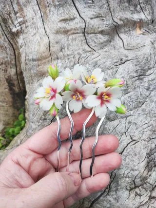 Precioso tocado con flores de almendro y detalles en verde. - Diseño floral delicado. - Base plateada con tres púas.