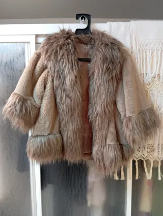 Chaqueta corta con un diseño de pelo sintético muy llamativo. Es una prenda ideal para añadir un toque de estilo. Talla L 100% poliéster Manga francesa: 35 cm de largo. - Mangas con detalle de pelo. - Cuello con pelo.