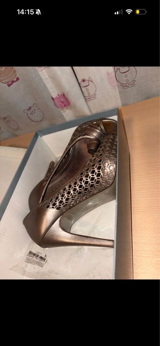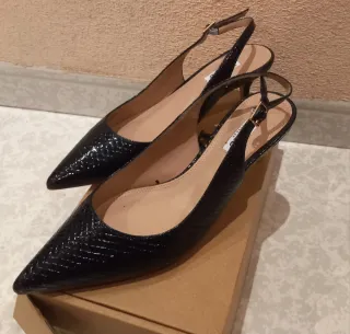 Marca Carlos Pla El único “defecto” o muestra de gaste es la suela del tacón, especialmente debajo del empeine, se muestra usado El zapato en si está en perfecto estado porque solo se ha usado para un bautizo El color es una mezcla entre negro y gris brillante En la caja (que es original) pone “Charol Negro”
