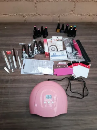 Completo kit para manicura de uñas, ideal para crear diseños profesionales en casa. Incluye una lámpara UV rosa. - Variedad de geles para uñas. - Herramientas para manicura. - Extensiones de uñas. - Adhesivos decorativos. P5
