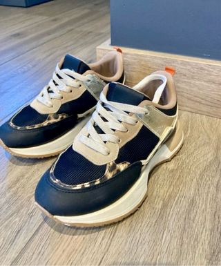 Zapatillas deportivas con un diseño llamativo que combina estampado de leopardo y detalles dorados. - Paneles de malla transpirable. - Detalle de estampado animal. - Acabado metalizado dorado. - Suela gruesa y cómoda.