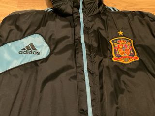 Abrigo largo oficial de la selección española de fútbol. - Diseño con las icónicas tres rayas de Adidas en las mangas. - Detalle de color azul claro en la zona del hombro y bolsillos. - Escudo de la selección española en el pecho. - Puños interiores y bolsillos de forro polar - Sin uso solo falta etiqueta. - Super Cálido