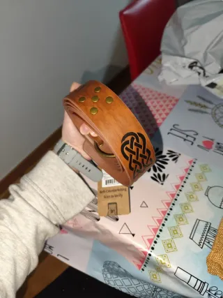 Cinturón de estilo medieval con un diseño único. - Hebilla metálica. - Material resistente y duradero. - Detalle de grabado en la correa. -Medida: 157 cm