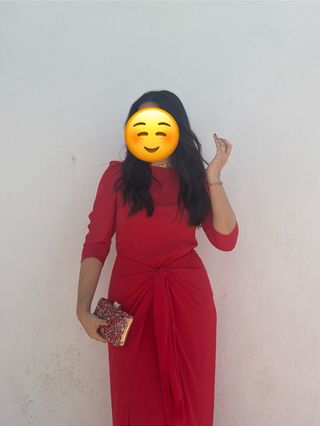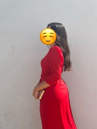 Elegante vestido midi de fiesta en color rojo. Presenta un diseño con nudo delantero que aporta un toque sofisticado. - Largo midi. - Escote redondo. - Manga francesa abullonada. - Nudo drapeado en la cintura. - Cierre con cremallera oculta en la espalda. Favorece mucho, se ajusta a la cintura y hace buena figura. Sirve para una 40 o 42 perfectamente.
