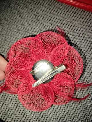 Bonito broche con forma de flor, ideal para adornar. - Diseño de flor con pétalos de tela. - Detalles de encaje y red. - Adornado con pequeñas perlas.