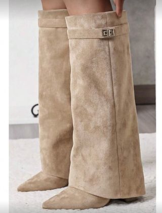 Botas altas de terciopelo en color beige. El material es suave y agradable al tacto. - Diseño alto hasta la rodilla. - Detalle de hebilla metálica en la parte superior. - Punta fina. - Están como nuevos, solo tiene un uso.