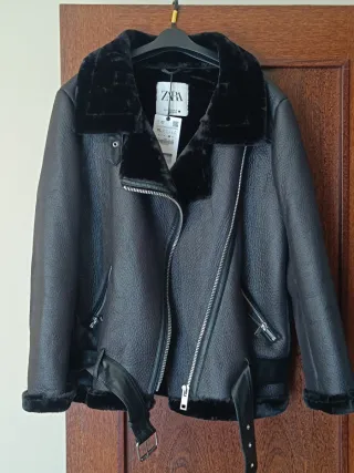 Chaqueta estilo biker de Zara, ideal para un look moderno. - Diseño tipo aviador. - Cuello con pelo sintético. - Cierre de cremallera asimétrica. - Puños y bajo con detalle de pelo sintético. - Cinturón con hebilla en el bajo.